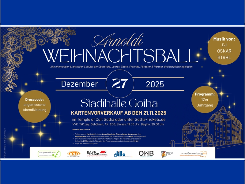 Der traditionelle Weihnachtsball der Arnoldischule Gotha findet wie gewohnt am 27. Dezember 2025 in der Stadthalle Gotha statt.