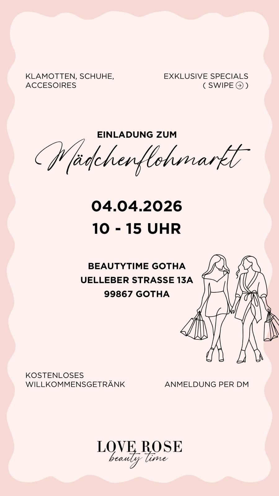 Mädechnflohmarkt in der Beautytime Uelleberstraße 13a in Gotha. Sei dabei, freu dich auf tolle Kleidung, Beauty Treatments und schöne Aktionen. Es gibt kein kostenloses Willkommensgetränk.