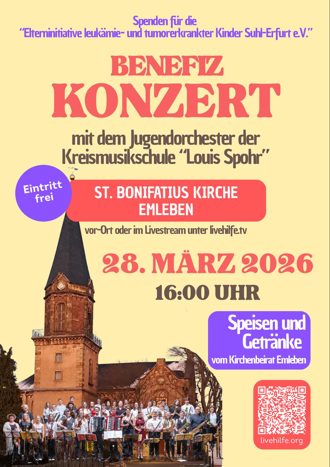 Wir freuen uns, Euch wieder zu einem gemeinsamen Konzert mit dem Jugendorchester der Kreismusikschule "Louis Spohr" Gotha in die St. Bonifatius Kirche in Emleben einladen zu dürfen.